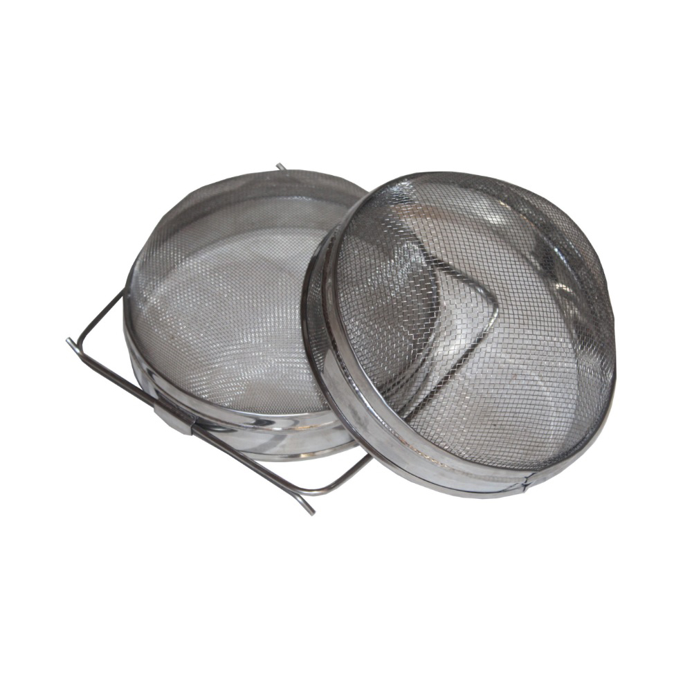 Фильтр (сито) для мёда D-200 мм нержавеющей двухсекционный выпуклый — предназначен для очистки меда от кусочков воска и других твердых частиц во время его слива из бака медогонки в бидоны или в другую тару. В комплект фильтра входят две секции с крупной и мелкой ячейкой сетки. Нижняя поддерживающая секция имеет опорную раздвижную рамку.