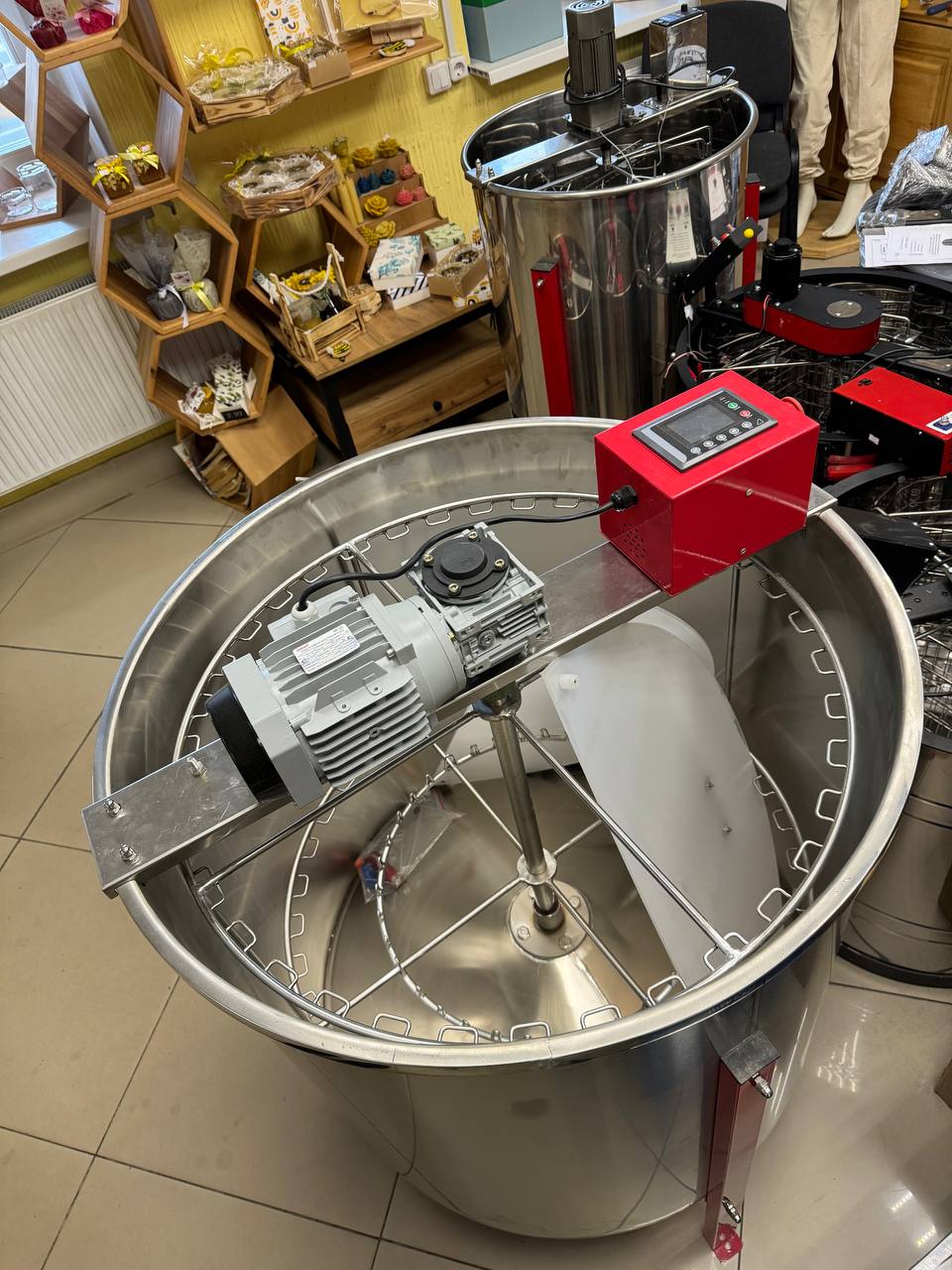 Данная модель радиальной рамочной медогонки подойдёт для стационарных и для передвижных пасек. Электрическая медогонка способна работать на 12-вольтовом аккумуляторе без подключения к сети. Её цифровой блок управления имеет 10 режимов скорости.