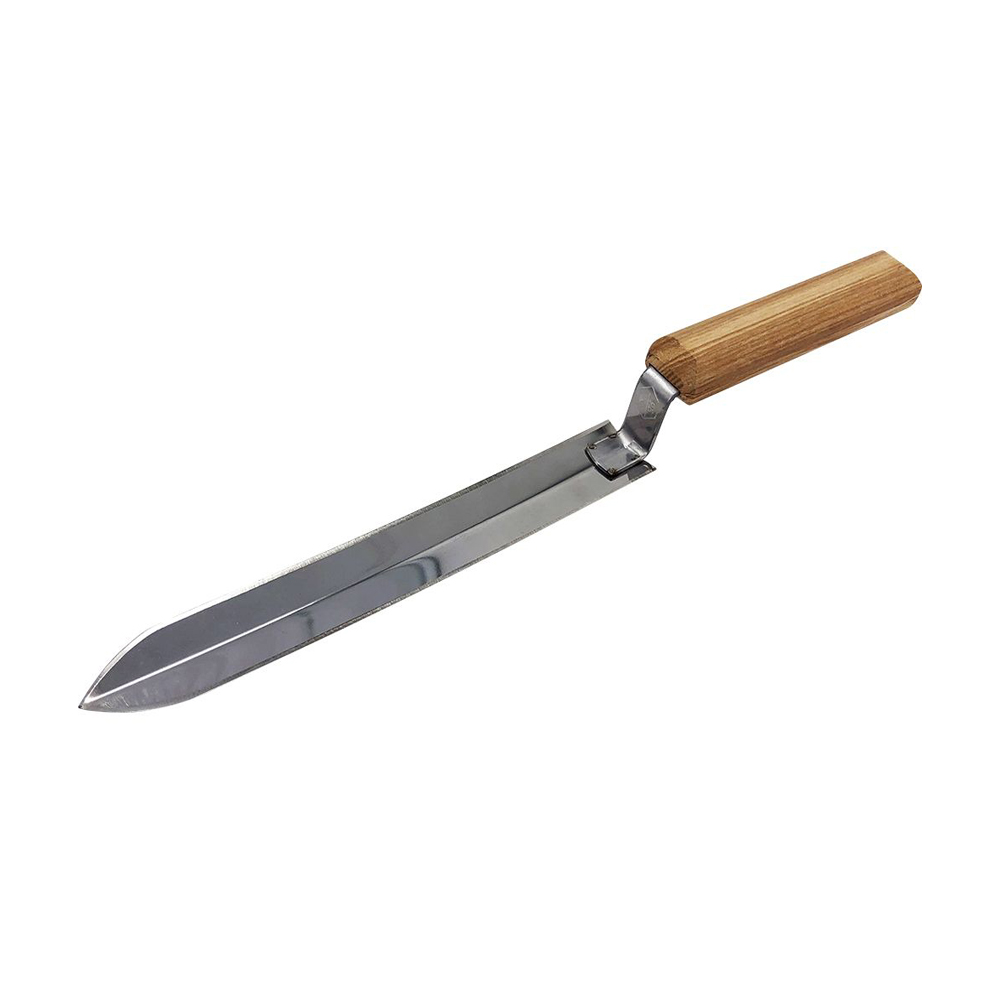 Описание: Пасечный нож угловой для распечатки сот — это ручной инструмент пчеловода, используемый для снятия забруса с медовых сотов перед откачкой мёда, а также для вырезки сотов из рамок, срезки восковых наростов и прочих работ.