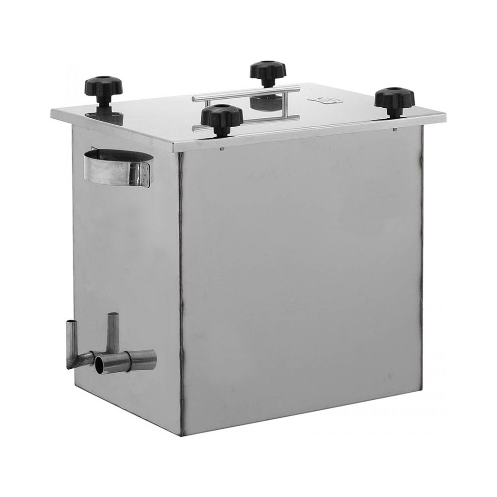 Воскотопка из нержавеющей стали используется для вытапливания воска на пару. Емкость устанавливается на плиту, внутрь, наливается вода, сверху устанавливается корзина с 7-мью рамками, закрывается крышка и сверху закручиваются прижимы. При нагревании восковое сырье начинает плавиться и через кран вытекает наружу.