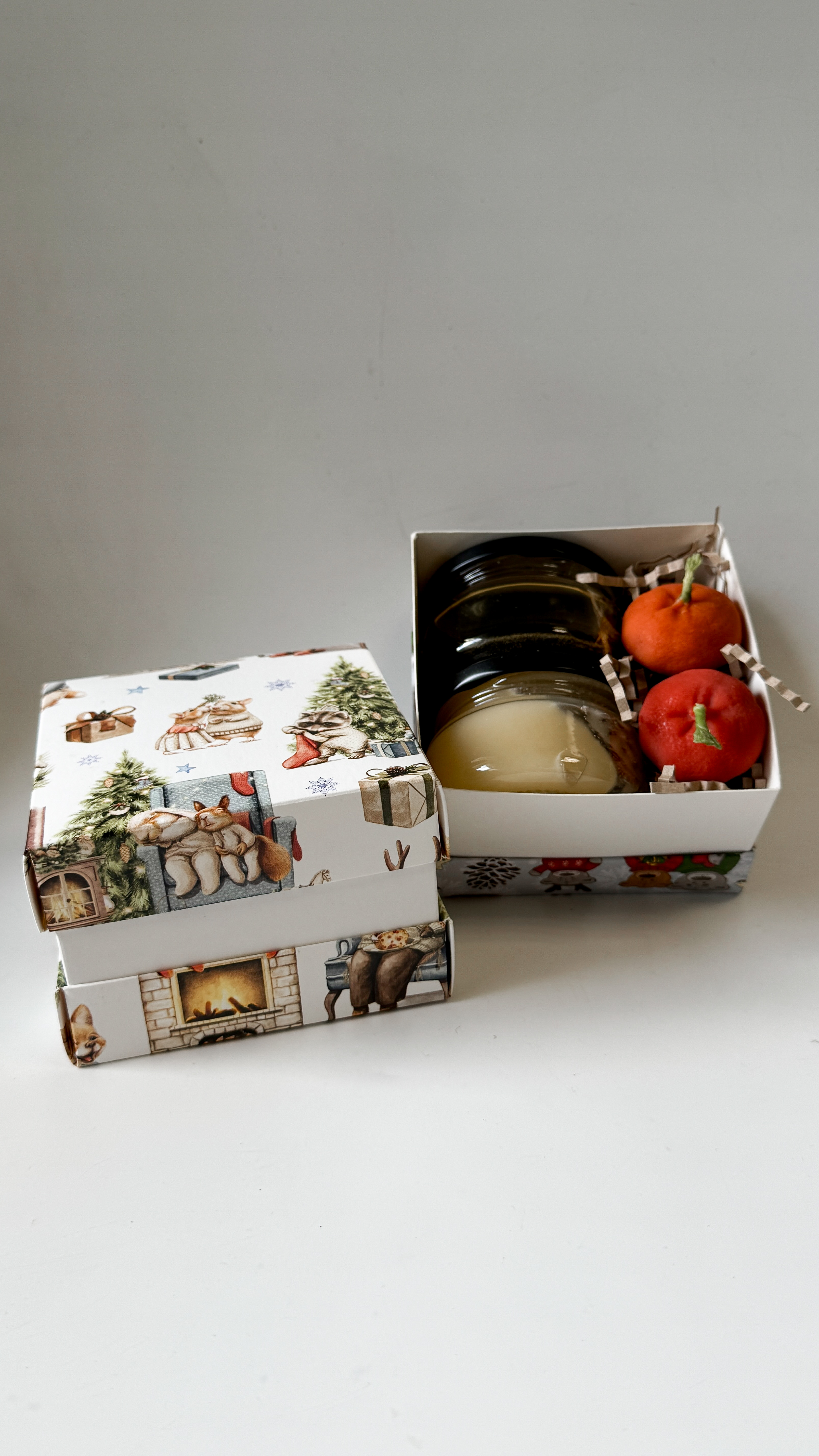 Состав: 2 разный вида меда по 200гр, 2 свечи "Мандарин"