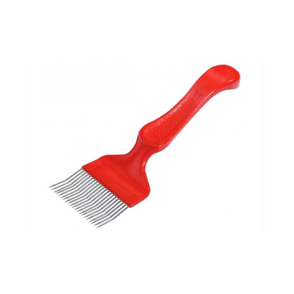 При распечатывании медовых сотов иголки вилки вводятся под забрус, начиная с нижнего бруска рамки по направлению к верхнему. Распечатывание сотов указанным способом более быстрое и легкое. Некоторые пчеловоды вилку дополнительно разогревают в горячей воде.