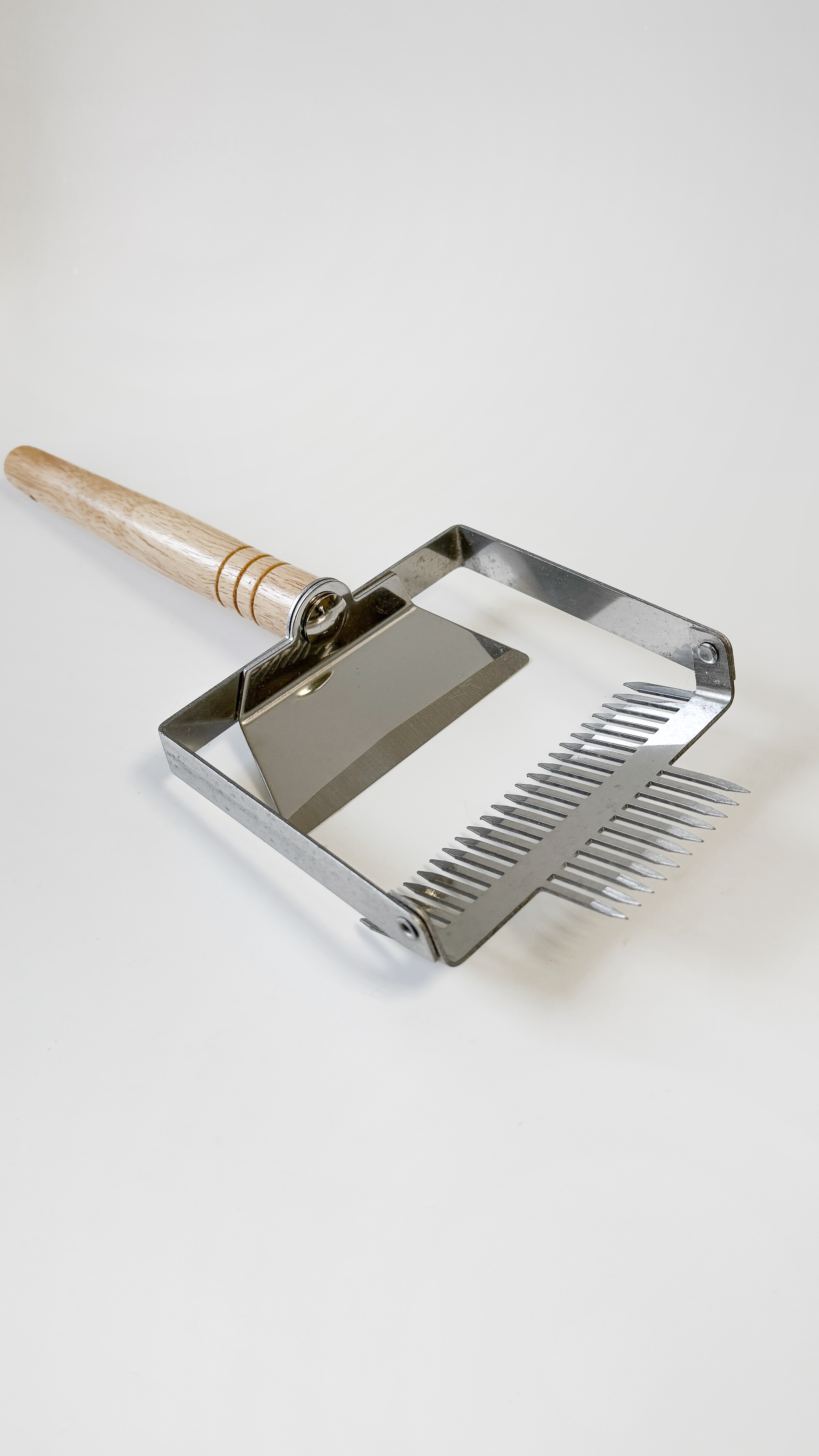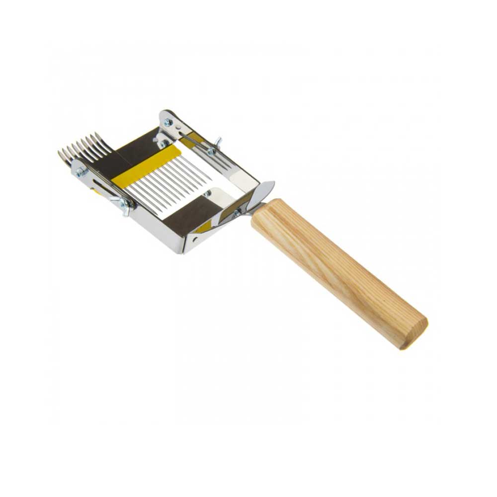 Вилка с деревянной ручкой выполнена из пищевой нержавеющей стали. На секции для распечатки размещен 1 ряд игол и 1 ряд зубцов. Угол наклона игл регулируется вручную (специальных винтов нет!). Пчеловод сам для себя подбирает под каким углом установить иглы, что бы было удобно распечатывать соты.
