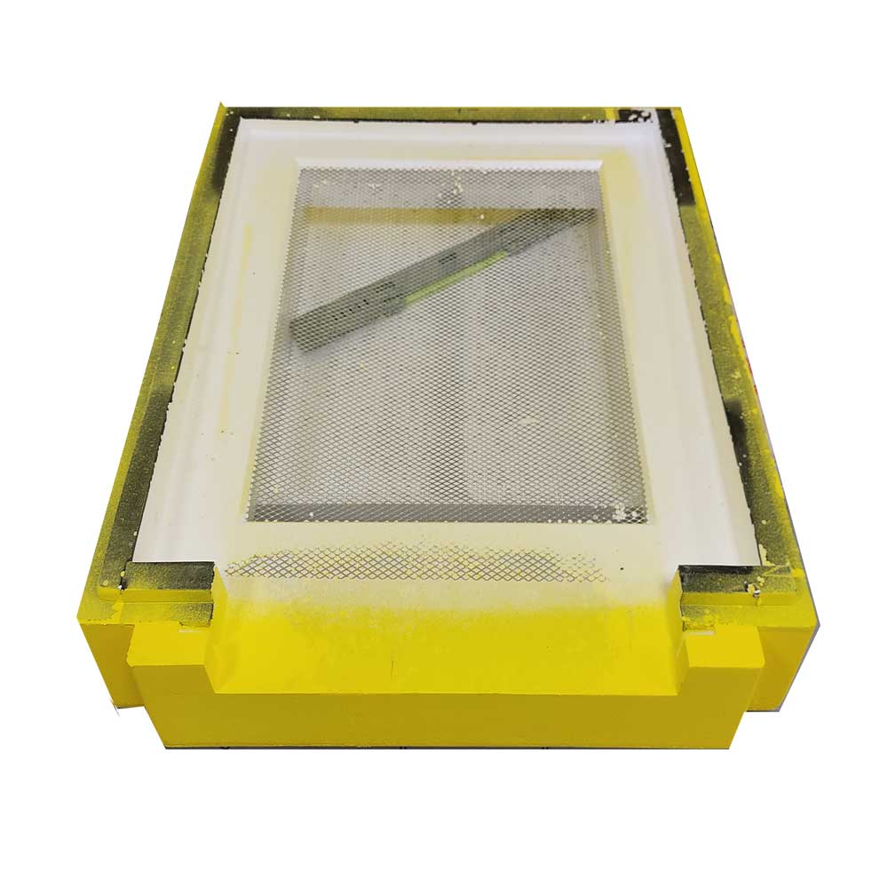 Дно гигиеническое, изготовлено из высокоплотного пенополистирола марки 501. Обрамлено пластмассовым шлицевым соединением. Оснащено противоварратозной алюминиевой сеткой. Клещ падает и проваливается через сетку на поддон и попасть обратно в улей уже не может. Это позволяет произвести раннюю диагностику варратоза. Поддон легко извлекается из дна. Окрашено специальной водоотталкивающей краской на силиконовой основе.