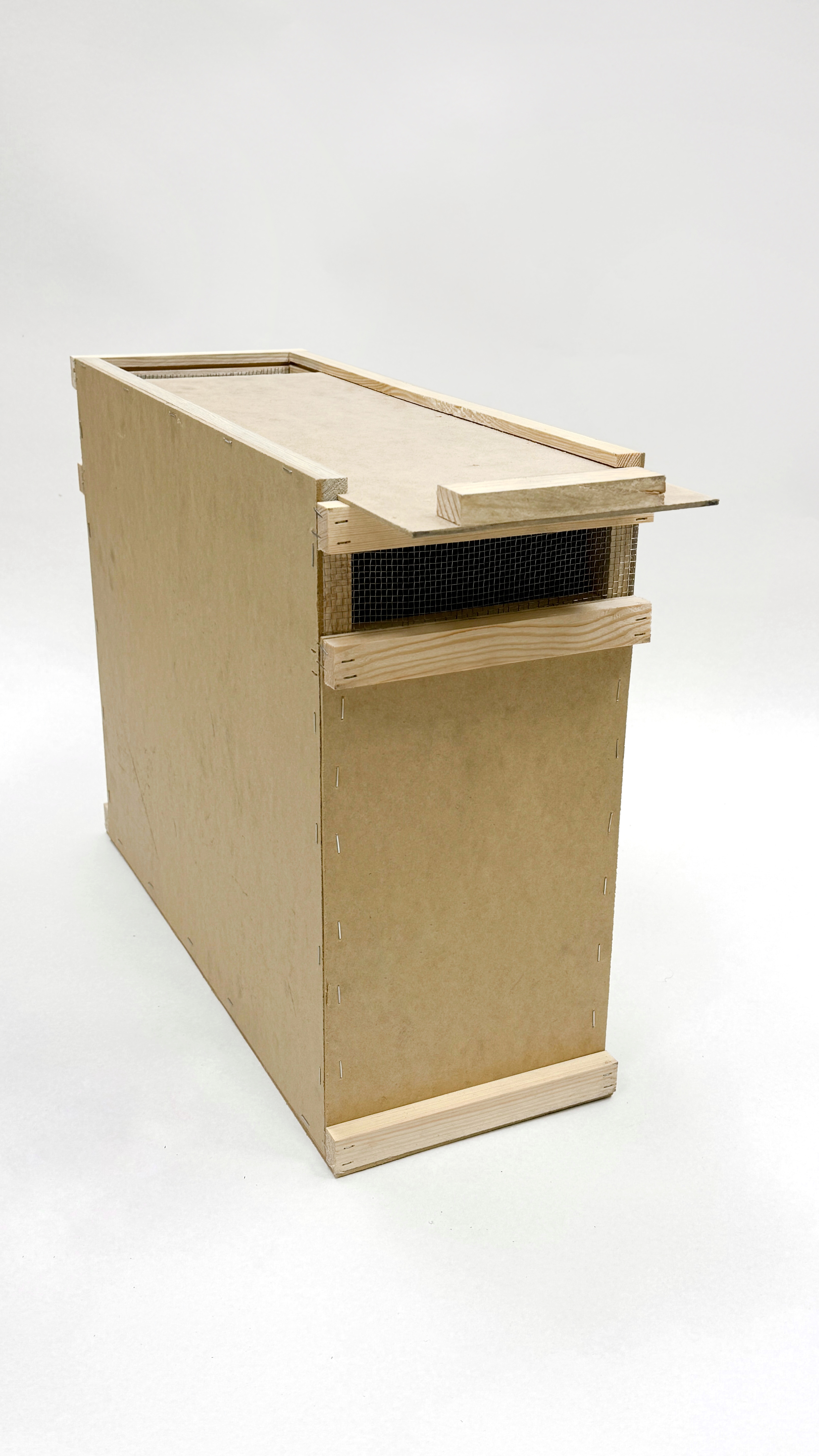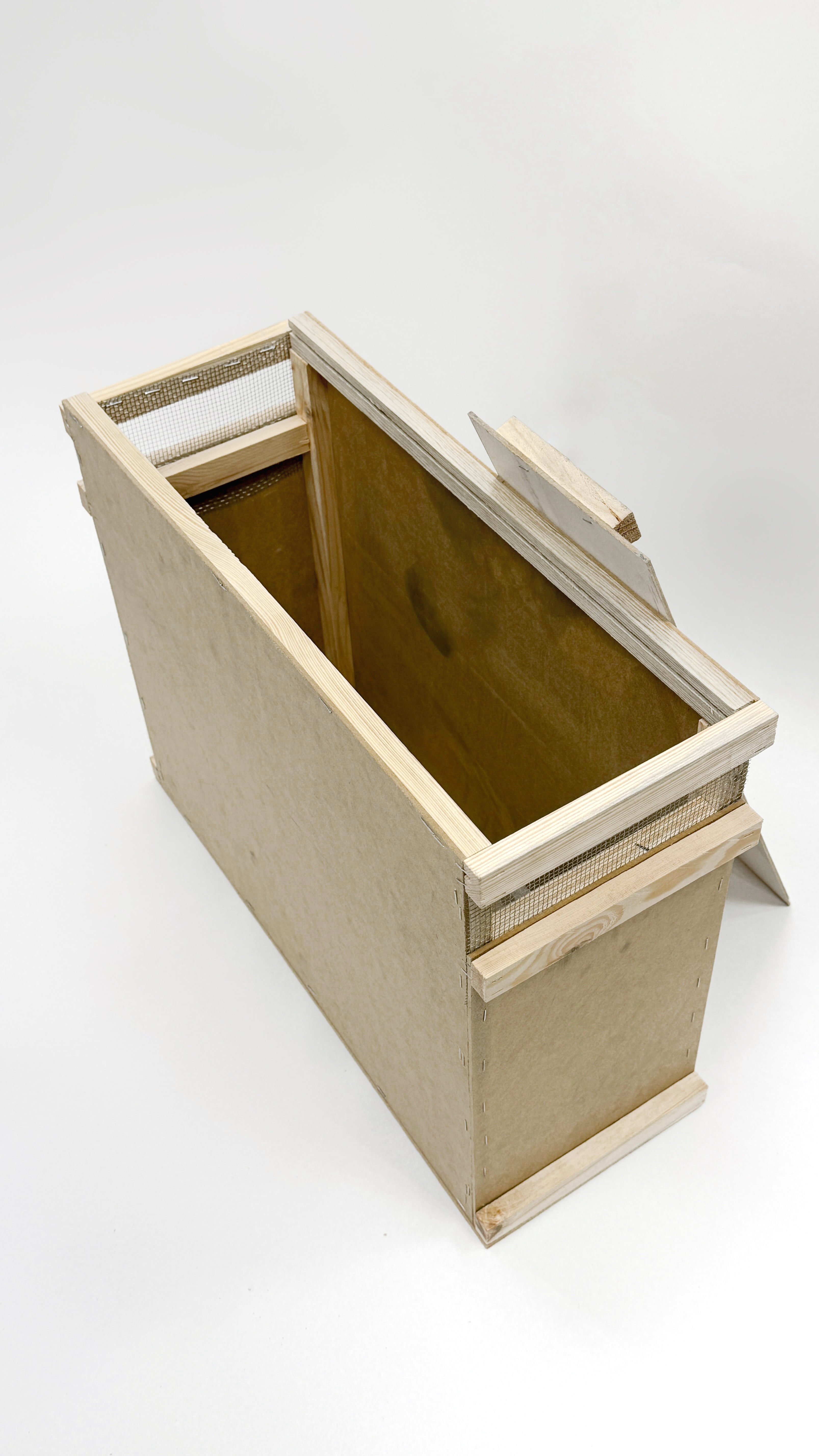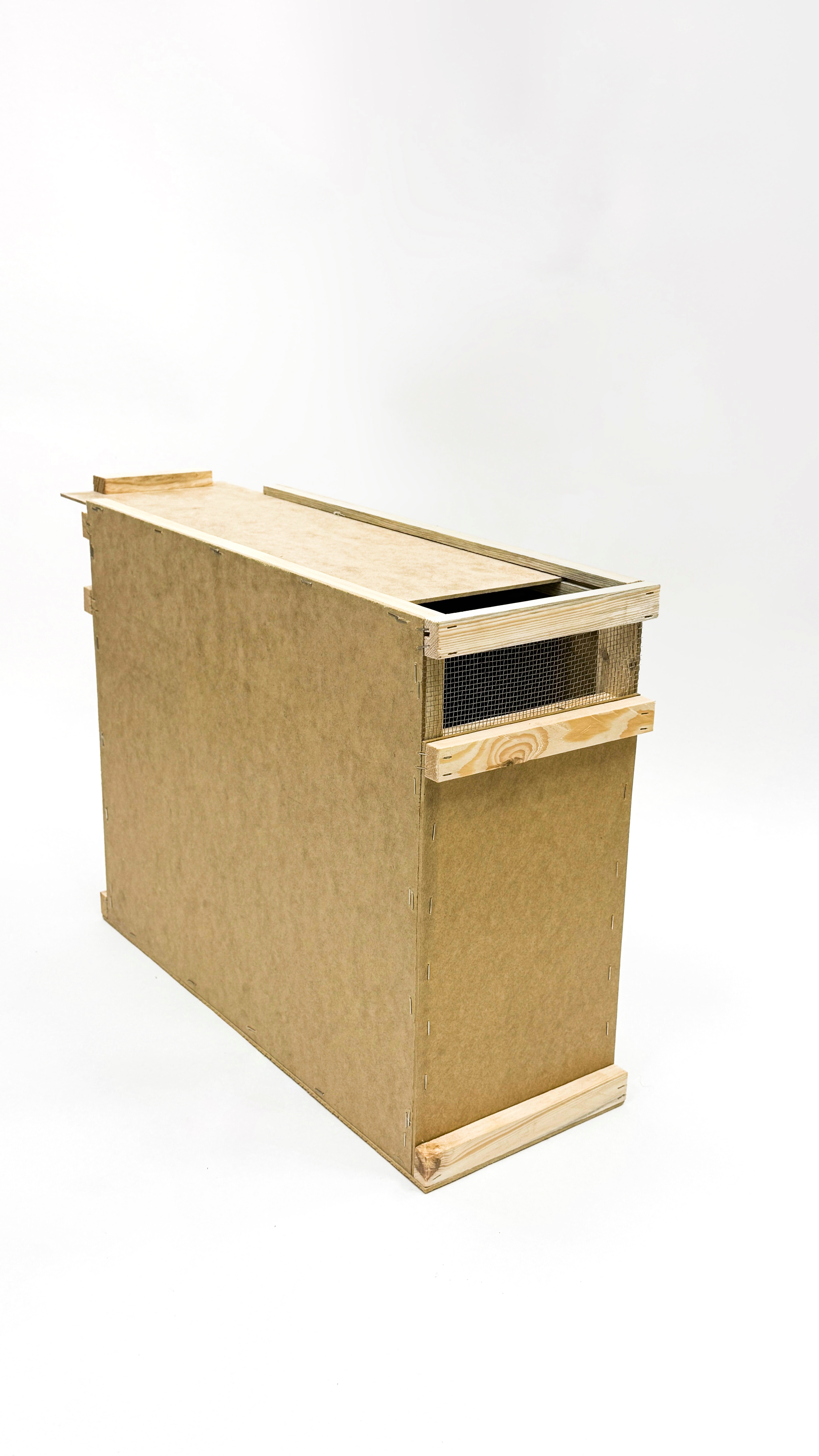 4-х рамочный ящик для пчелопакета, на дадановскую гнездовую рамку. Также нижняя гребёнка для рамок позволяет перевозить пчёл и на рутовской рамке. Крышка ящика сдвижная и фиксируется от открывания скобой или гвоздиком. Высокое надрамочное и подрамочное пространство, а также и вентиляционные закрытые сеткой отверстия на противоположных торцах ящика, позволяют перевозить пчёл на очень большие расстояния без риска запаривания, при соблюдении основных правил перевозки пчёл. Ящики вставляются друг в друга и этим фиксируются от горизонтальных смещений влево-вправо и вперёд-назад. Вертикально можно устанавливать до 4-х ящиков. Наружные боковые и торцевые бруски обеспечивают необходимое расстояние между ящиками для свободного доступа воздуха в пчелопакет для пчёл. Конструктивная прочность предусматривает неоднократное их использование при перевозке в них пчёл, а также возможность в дальнейшем использование их для хранения суши, переноски для рамок, ловушки для пчёл, и временной тары для однорамочных отводков.